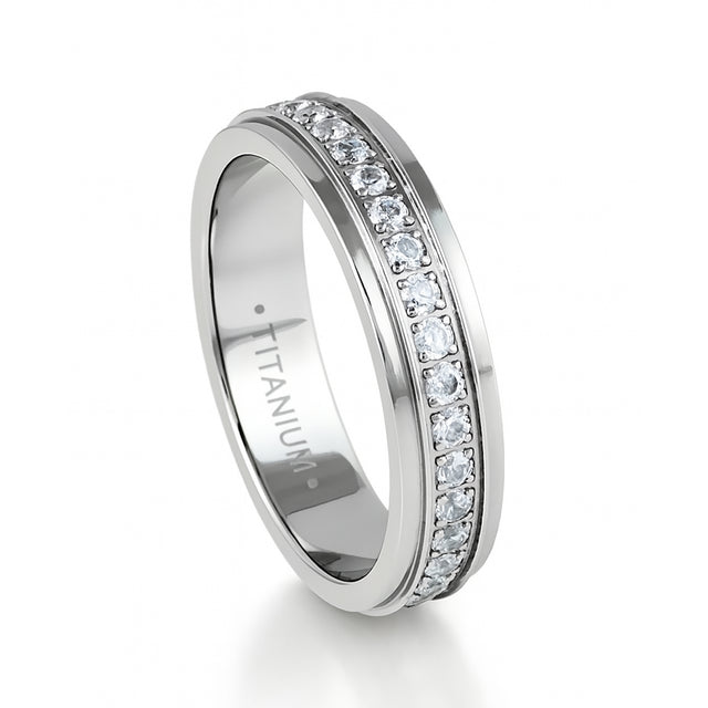 Silver Titanium Ring Full Eternity White Cubic Zircon Diamonds Stepped Edges 5mm - 4 / Silver / Titanium is backordered and will ship as soon as it is back in stock.