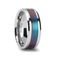 This one of a kind Tungsten Carbide wedding band design by Thorsten is sure to catch anyones eye. The center of the ring is inlaid with a special type of material that changes from beautiful blue to purple hues depending on the angle that you are looking at it.