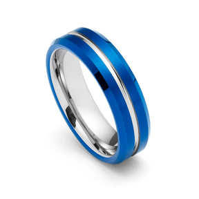 6mm - Blue & Silver Tungsten Carbide Ring - Grooved Beveled Edges - Wedding Band