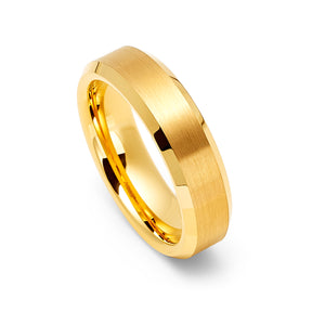 6mm - 14k Yellow Gold Tungsten Carbide Wedding Band Beveled Edges Brush Center