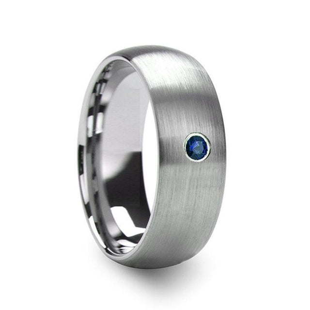MELANTHIOS Mens Domed Brushed Tungsten Wedding Ring with Blue Diamond Center - 6mm or 8mm