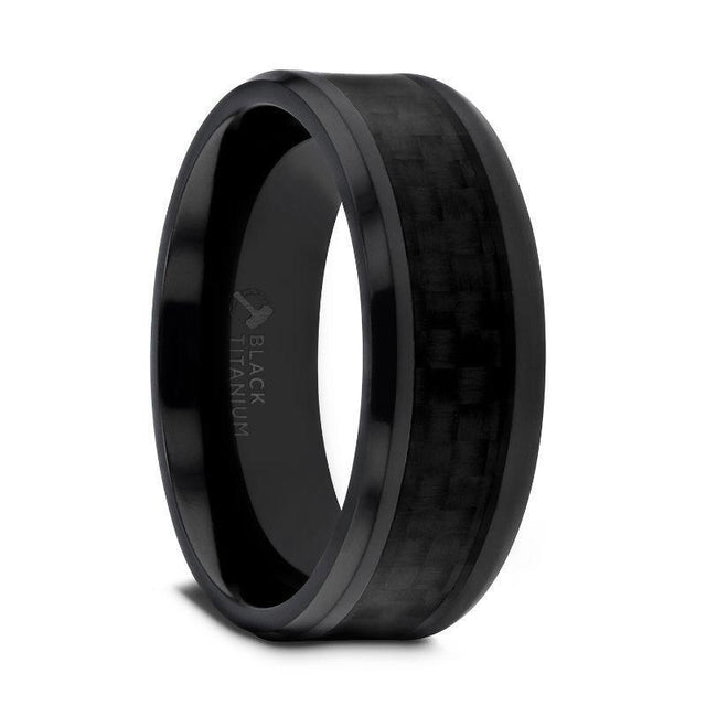 OXYN Black Titanium Polished Beveled Edges Black Carbon Fiber Inlaid Mens Wedding Band - 6mm & 8mm