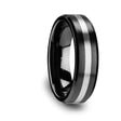 This bold and emphatic Black Ceramic wedding band design by Thorsten has beveled edges features an overall smooth brushed black finish set off by a single, contrasting Tungsten Carbide band at its center.
