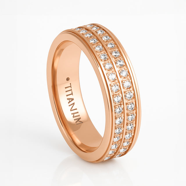 Rose Gold Titanium Ring Full Eternity White Cubic Zircon Diamonds Stepped Edges 6mm