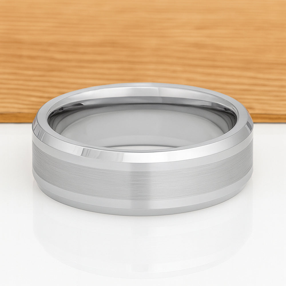 White Silver Platinum-Like Finish Tungsten Ring with Brushed Center and Polished Beveled Edges-8mm