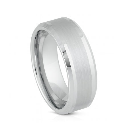 White Silver Platinum-Like Finish Tungsten Ring with Brushed Center and Polished Beveled Edges-8mm