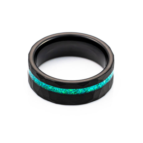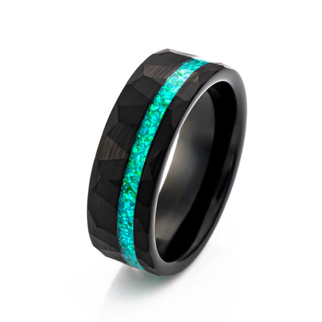 8mm - Black Tungsten Wedding Ring, Crushed Green Opal Hammered Ring