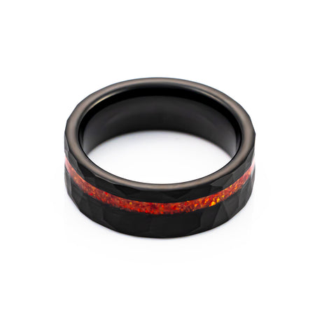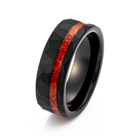 8mm - Black Tungsten Wedding Ring, Crushed Orange Opal Hammered Ring