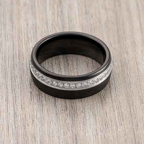 8mm - Black Tungsten Wedding Band, Off Center White Diamonds Brushed Ring