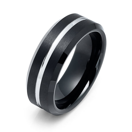 8mm - Black Tungsten Wedding Band Brush Finish Silver Center Groove