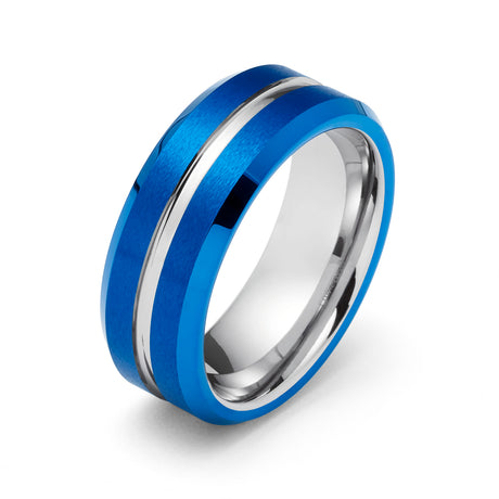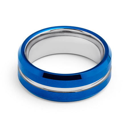 8mm - Blue & Silver Tungsten Carbide Ring - Grooved Beveled Edges - Wedding Band