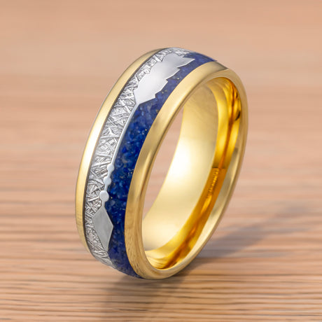 8mm- yellow GOLD TUNGSTEN ARROW RING W/ BLUE LAPIS LAZULI, FAUX METEORITE