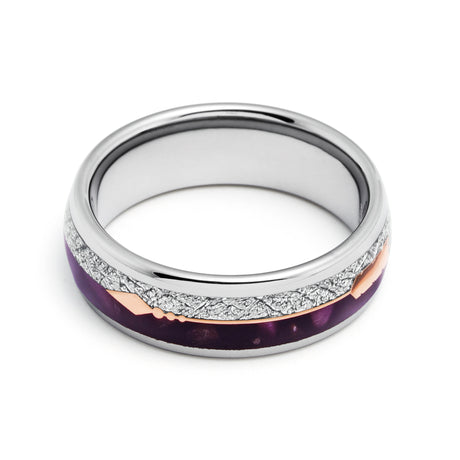 8mm- Silver Tungsten Dome Ring, W/ Purple Agate Rose gold Arrow & Meteorite Inlay