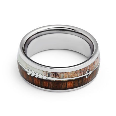8mm - Silver TUNGSTEN Carbide ARROW RING W/ Antler & Koa Wood Inlay