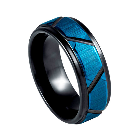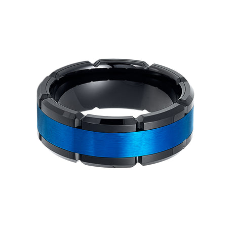 8mm Black & Blue Tungsten Carbide Notched Edges Wedding Ring, Engagement Band
