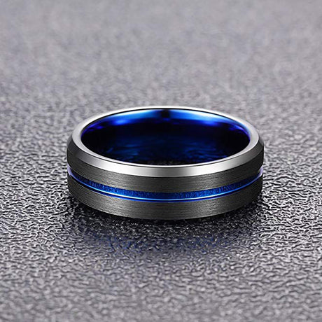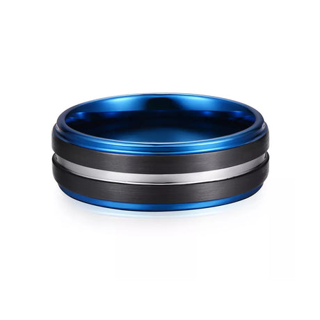 8mm Blue Tungsten Carbide Ring W/ Black Brush & Silver Center Groove