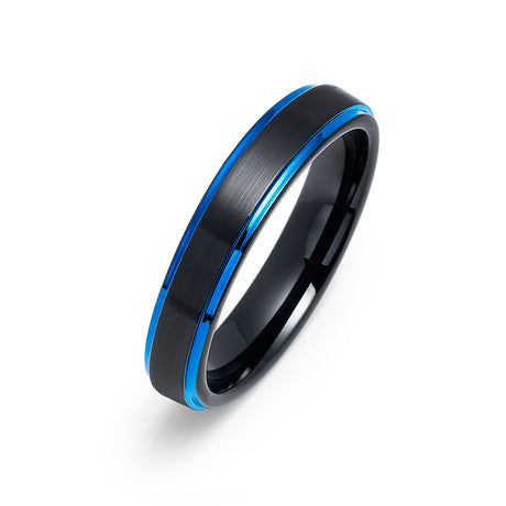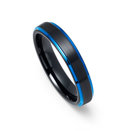 4mm - Tungsten Wedding Band Brushed Black & Blue Stepped Edges