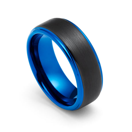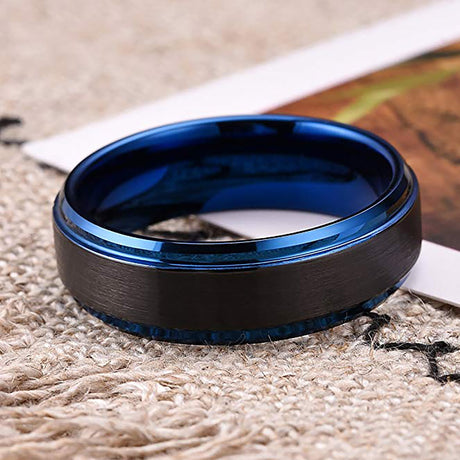 8mm - Tungsten Wedding Band Brushed Black & Blue Stepped Edges