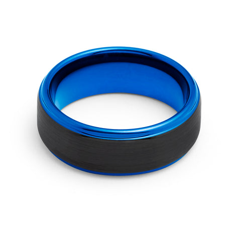 8mm - Tungsten Black & Blue Ring, Brushed Finished, Beveled Edges