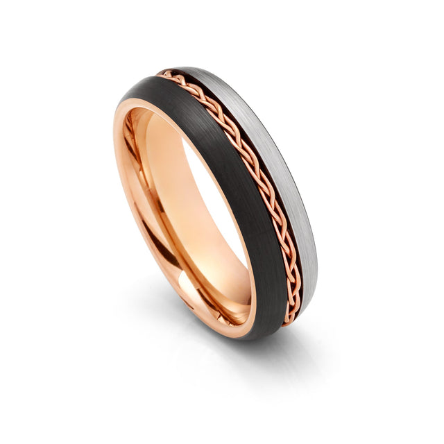 6mm Rose Gold Tungsten Carbide Ring Braid Ring Brushed Black & Gunmetal Center