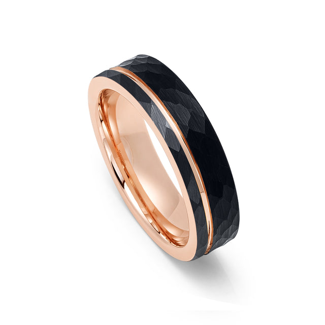 6mm Hammered Black Brushed Tungsten Carbide Wedding Band with Rose Gold Groove