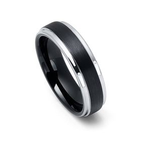 6mm Black Tungsten Wedding Band, Black Brushed Center w/ Silver Stepped Edges