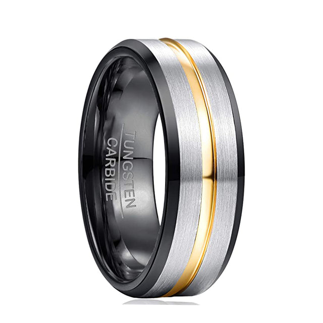 8mm - Black Tungsten Ring Silver Brush With Gold Groove, Wedding Ring