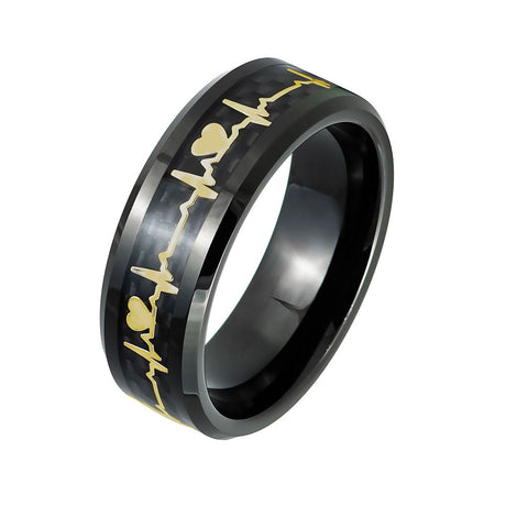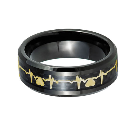 8mm - Tungsten Wedding Band Carbon Fiber W/ 14K Gold Heartbeat Inlay