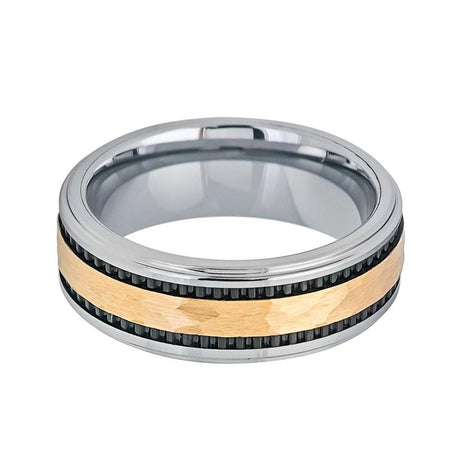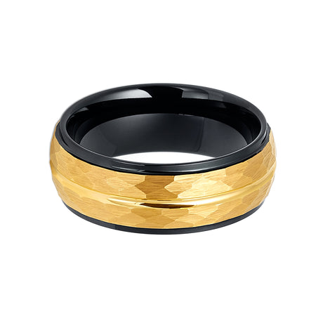 8mm - Black & Gold Hammered Tungsten Wedding Band W/ Stepped Edges