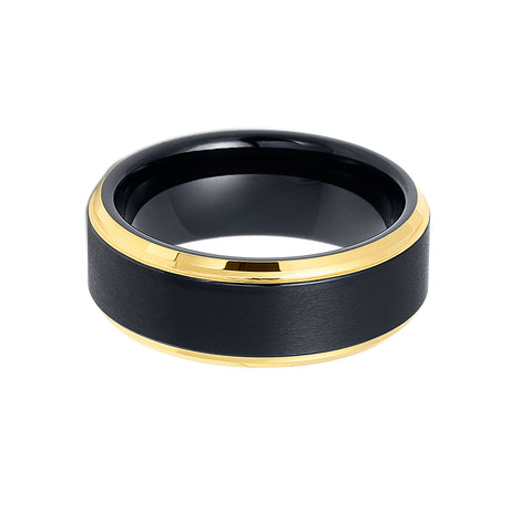 8mm - Tungsten Black & Gold Wedding Band, Stepped Edges, Brushed Ring