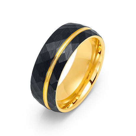 8mm- Brushed Yellow Gold Faceted Black Tungsten Off centered Gold Groove.