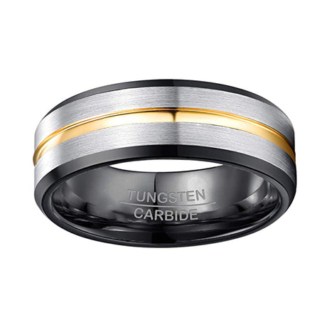 8mm - Black Tungsten Ring Silver Brush With Gold Groove, Wedding Ring