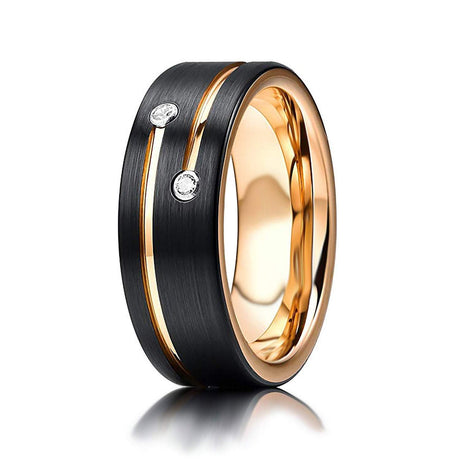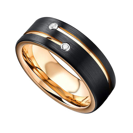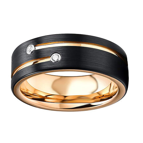Mens Black Tungsten Carbide Wedding Band with Gold Grooves 2 CZ Diamonds.