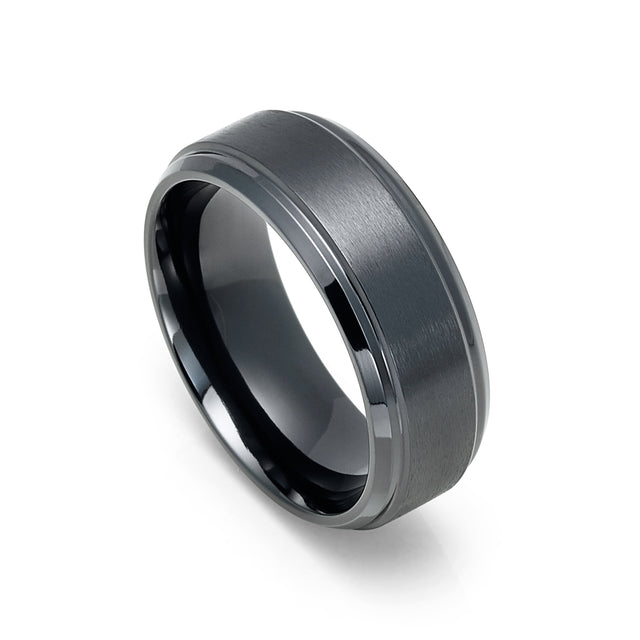 8mm Gunmetal Zirconium Ring with Brushed Center Stepped Edges - 8 / Black / Zirconium is backordered and will ship as soon as it is back in stock.