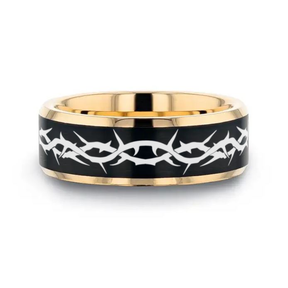 Gold Plated Tungsten Polished Beveled Ring with Brushed Black Center with Thorn Crown Engraving
