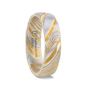 CERSEI Gold Color Domed Brushed Damascus Steel Mens Wedding Band with Vivid Etched Design - 6mm & 8mm