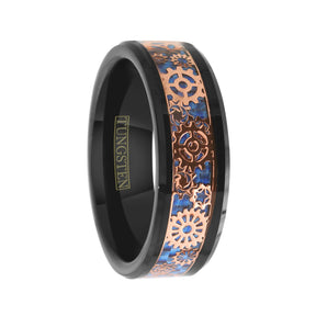 8-mm Tungsten Ring Rose Gold Steampunk Clockwork Gears On Dazzling Royal Blue Faux Carbon Fiber Inlay. - 7 is backordered and will ship as soon as it is back in stock.