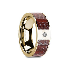 Crimson red dinosaur bone that required over 200 million years to form is inlaid directly into this wedding band. This dinosaur wedding band consists of a 14K yellow gold wedding band with a round cut white diamond, and has brightly polished edges. This comfort fit wedding ring is ideal to symbolize your love, and is available in an 8 mm width.