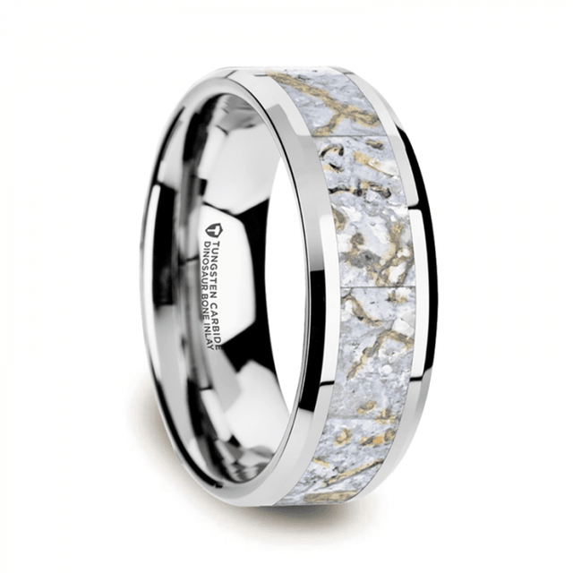 This rare wedding band is 230 years in the making! Expertly fashioned in long-lasting tungsten carbide, this ring is nothing like your typical wedding band. The center is inlaid with an authentic mineralized dinosaur fossil that has been cut and polished to a brilliant shine. The coloring is created by the minerals that slowly replaced the bone over millions of years. This particular fossil has a white hue. Both edges are beveled and polished, adding even more shine to this amazing wedding band.