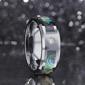 HONOLULU Mother of Pearl Inlay Tungsten Carbide Ring with Beveled Edges and White Diamond - 8mm