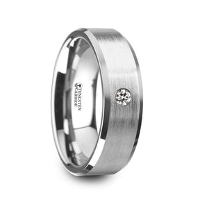 This extremely desired tungsten carbide wedding ring is one of the most sought after designs in men's wedding bands. Created with a detailed brushed finish and high polish beveled edges, the single white diamond shows beautifully against the brushed finish.