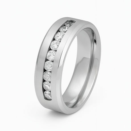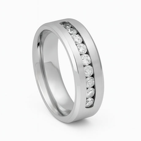 Silver Titanium Wedding Band W/ 9 Channel Set CZ Diamond Beveled Edges 8mm