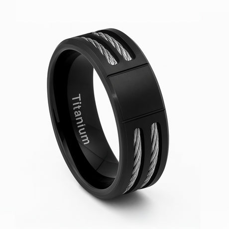 Black Titanium Ring Grooved Center Beveled Edges Double Cable Inlay 8mm