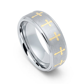 8mm - Silver Tungsten Wedding Ring, Gold Cross Ring, Stepped Edges