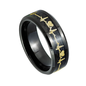 8mm - Tungsten Wedding Band Carbon Fiber W/ 14K Gold Heartbeat Inlay - 7 / Black & Gold / Tungsten Carbide is backordered and will ship as soon as it is back in stock.