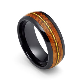 8mm Black Tungsten Koa Wood Ring W/ GENUINE GUITAR STRING