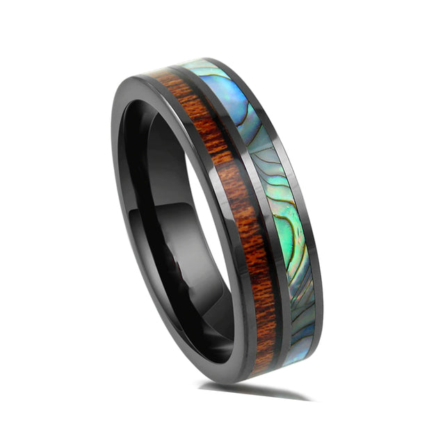 6MMmm - Black Tungsten Whiskey Barrel Wood Ring, W/ ABALONE INLAY RING