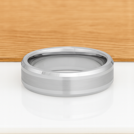White Silver Platinum-Like Finish Tungsten Brushed Center Ring With Polished Raised Edges - 8mm