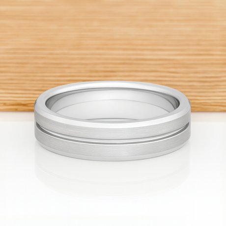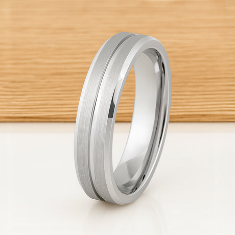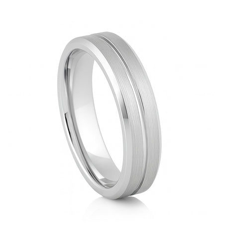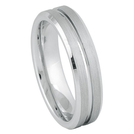 White Silver Platinum-Like Finish Tungsten Carbide Grooved Center Beveled Edged Ring - 6mm