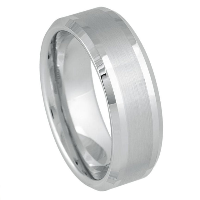 White Silver Tungsten Ring with Brushed Center and Polished Beveled Edges-8mm